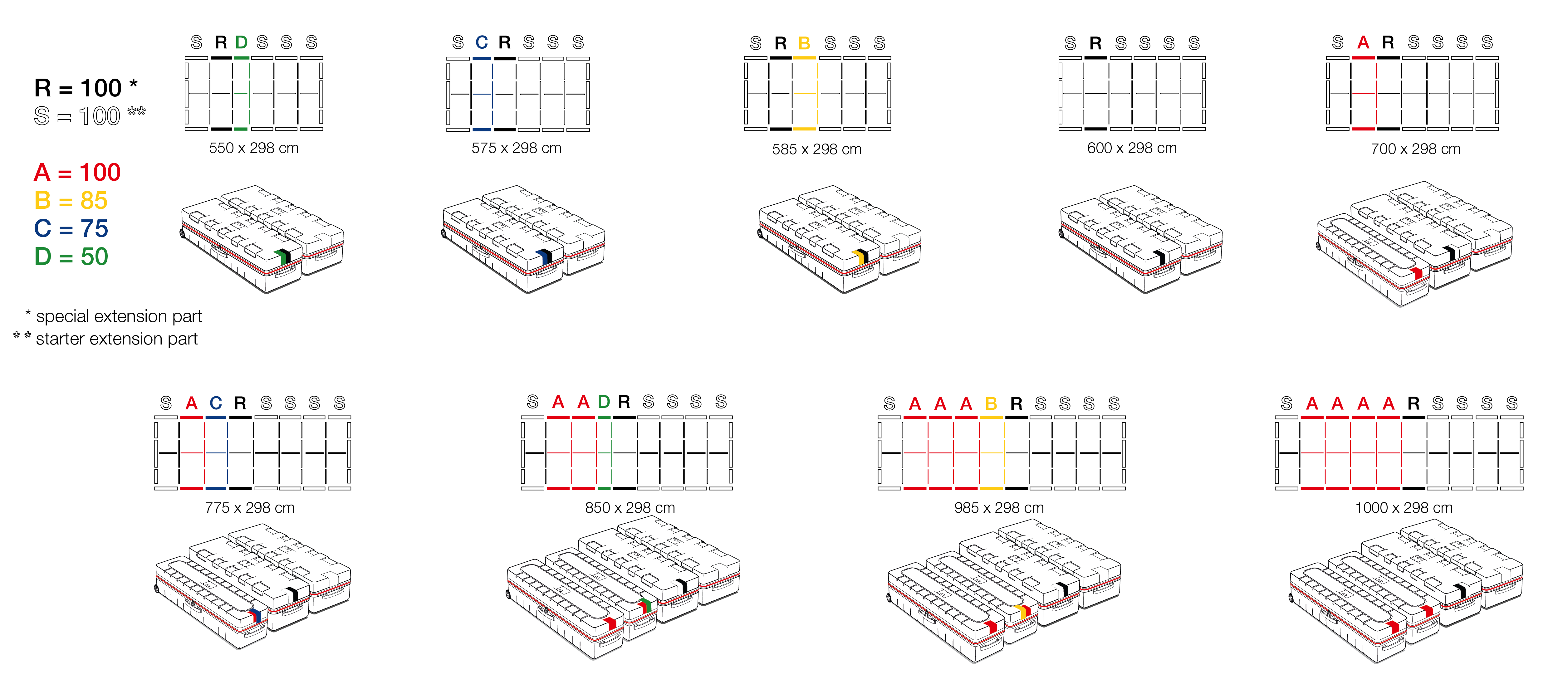 Nutzen Sie die modulare Welt von REAL BIG LEDUP®, beginnend mit einem 500cm oder 600cm breiten Startmodul. Anschließend erweitern Sie das System auf eine maximale Breite von 1000 cm mit 30, 40, 50, 75, 85 oder 100 cm breiten Erweiterungsmodulen. Wir bieten auch verschiedene Höhen von 200, 230, 248 und 298 cm an.