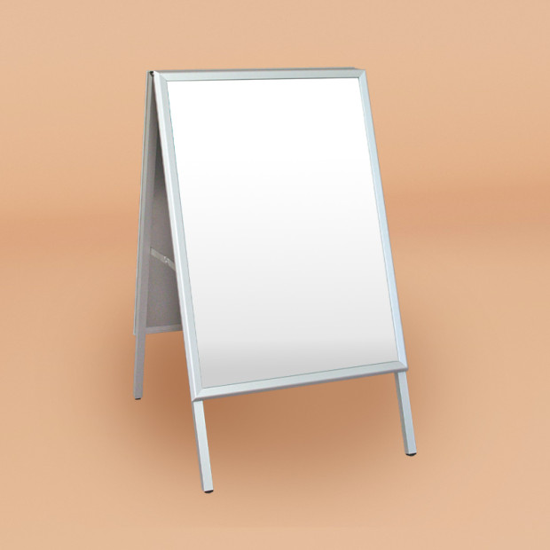 A-stand ist aus Aluminium gefertigt und verfügt über Schnapprahmen zum schnellen und einfachen Wechseln der Paneele. Im Lieferumfang sind Antireflex-Schutzfolien enthalten, die das Plakat vor Sonnenlicht schützen.