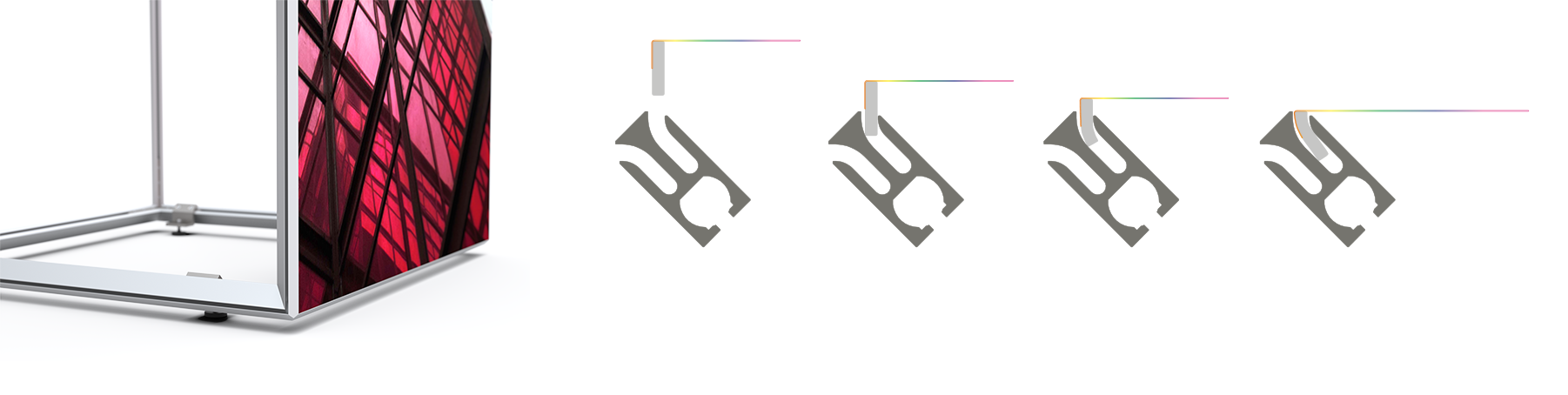 Die Multi Tower Profile aus silber eloxiertem Aluminium sind leicht mit LED-Lampen hinterleuchtet und einfach zu transportieren.